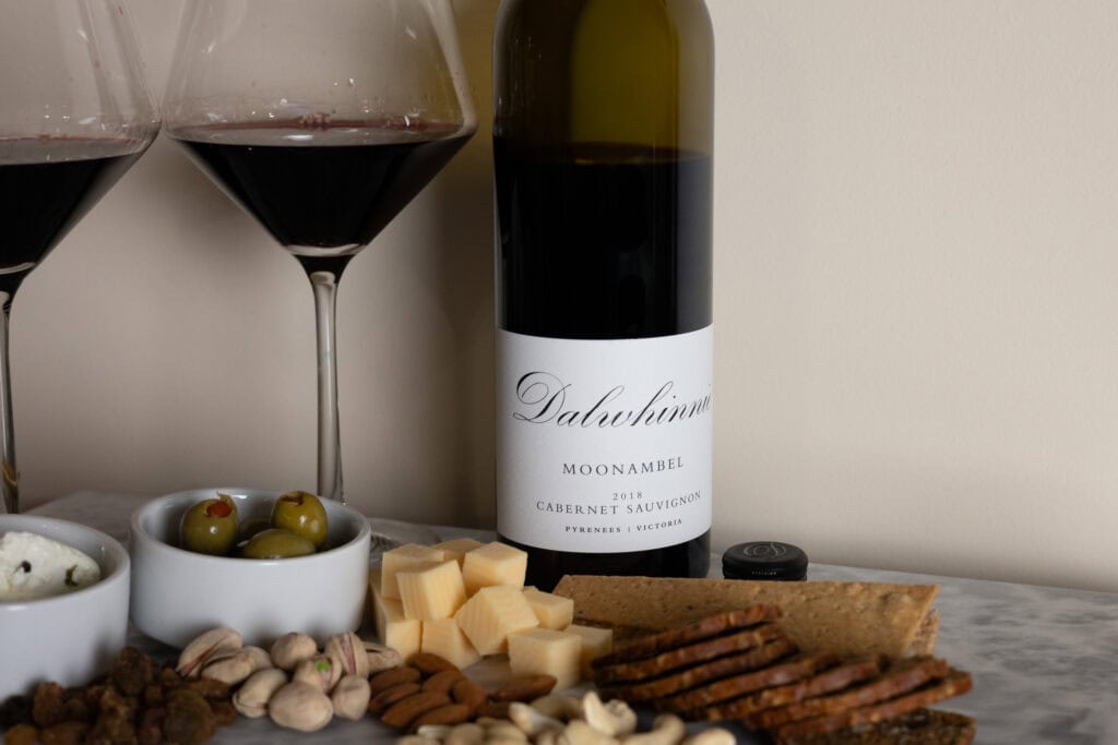 Tasted alongside a mix of cheeses, dips, and roast duck, the Dalwhinnie 2018 Cabernet Sauvignon shows how strongly its structure reacts to salt and fat: